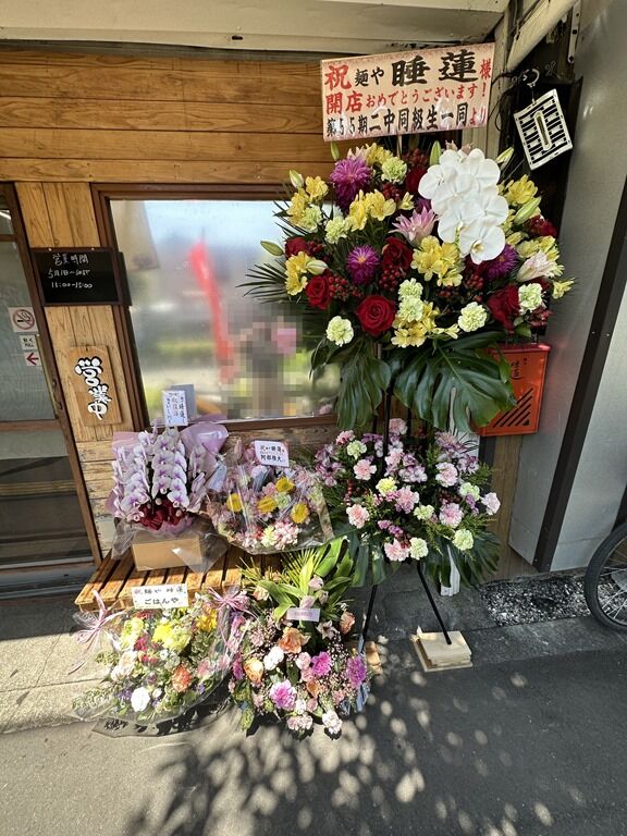 店の場所は西八王子駅北口約1.2km。八王子警察署の並び。店頭開店祝花は麺笑いし川、他から。