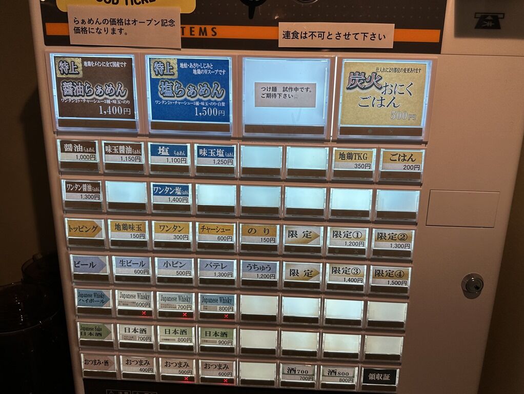 定刻3分前早開けオープン。2巡目先頭でしばらく待機。入店するとまず券売機で食券購入です。主なメニューは醤油らぁめん1000円、塩らぁめん1100円、炭火おにくごはん500円、地鶏TKG350円、他。オープン記念価格は前回と変わらず。つけ麺はまだ試作中。厨房・ホールは店主さんと女性のいつものフォーメーション。