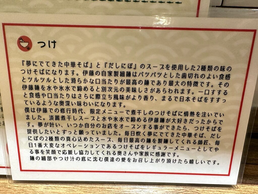 主なメニューは、夢にでてきた中華そば2000円、夢かけ1200円、だしにぼ1200円、しおにぼしoilそば1000円、つけ(夢orだし)1500円、伊藤麺釜玉(数量限定)800円、岩中豚丼500円、他。