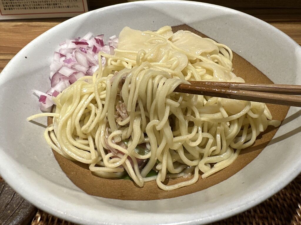 「しおにぼしoilそば」最大の特徴は3種の麺で、店主修行先伊藤の自家製細麺、丸山製麺製特注太麺、自家製極太手打ち麵を使用。3種の麺それぞれのサイズや個性がMIXされる事でより食感にダイナミックなシナジー効果を発揮。そしてoilや具材と混ざり合って、味、食感、食べ応え、ワクワク感が一気にブースト。「Nibo Nibo Cino」の汁なし「にぼにぼちー」のでも度肝を抜かれましたが、店主さんは煮干しのマジシャンで汁なしのマイスターかと。他に類のないオンリーワンの油そば(oilそば)ですごく美味しい!