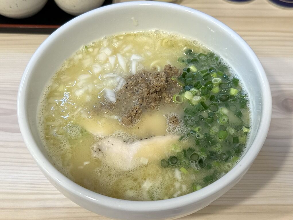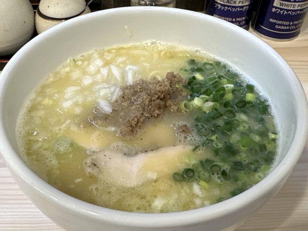 スープはとろっとクリーミーでなめらかな鶏白湯塩味。鶏の癖や鶏らしさは皆無で、まるで上質なクリーシチューの様。鶏そぼろが入ってるとこがまた良くて、麺やスープと鶏そぼを一緒にいただくと、旨みが爆発的に加速します。フルコースの一品として出せそうなハイクオリティな鶏ボタスープでとても美味しい!