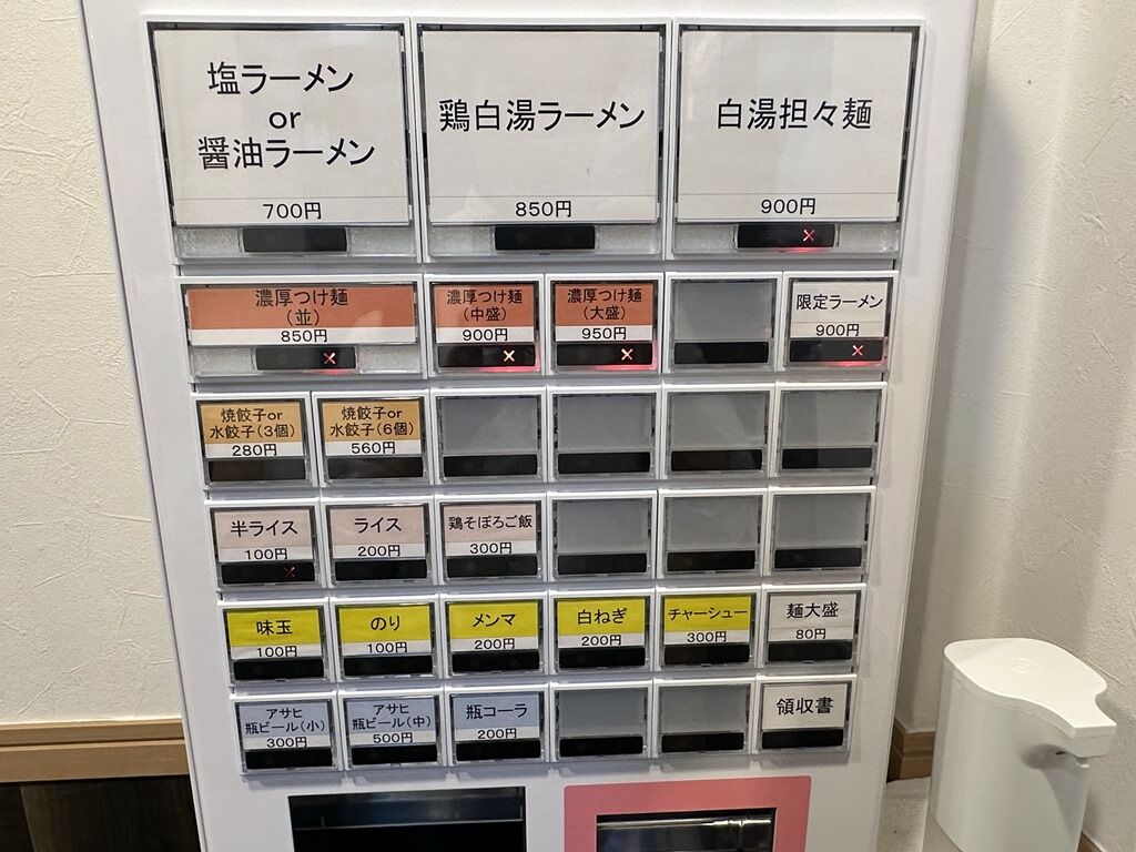 入店するとまず券売機で食券購入です。主なメニューは、塩ラーメン・醤油ラーメン700円、鶏白湯ラーメン850円、白湯担々麺900円(昼営業のみ)、濃厚つけ麺(並)850円、他。基本メニューが700円からとは良心的。訪店時、「濃厚つけ麺」と昼のみの「白湯担々麺」は準備中。