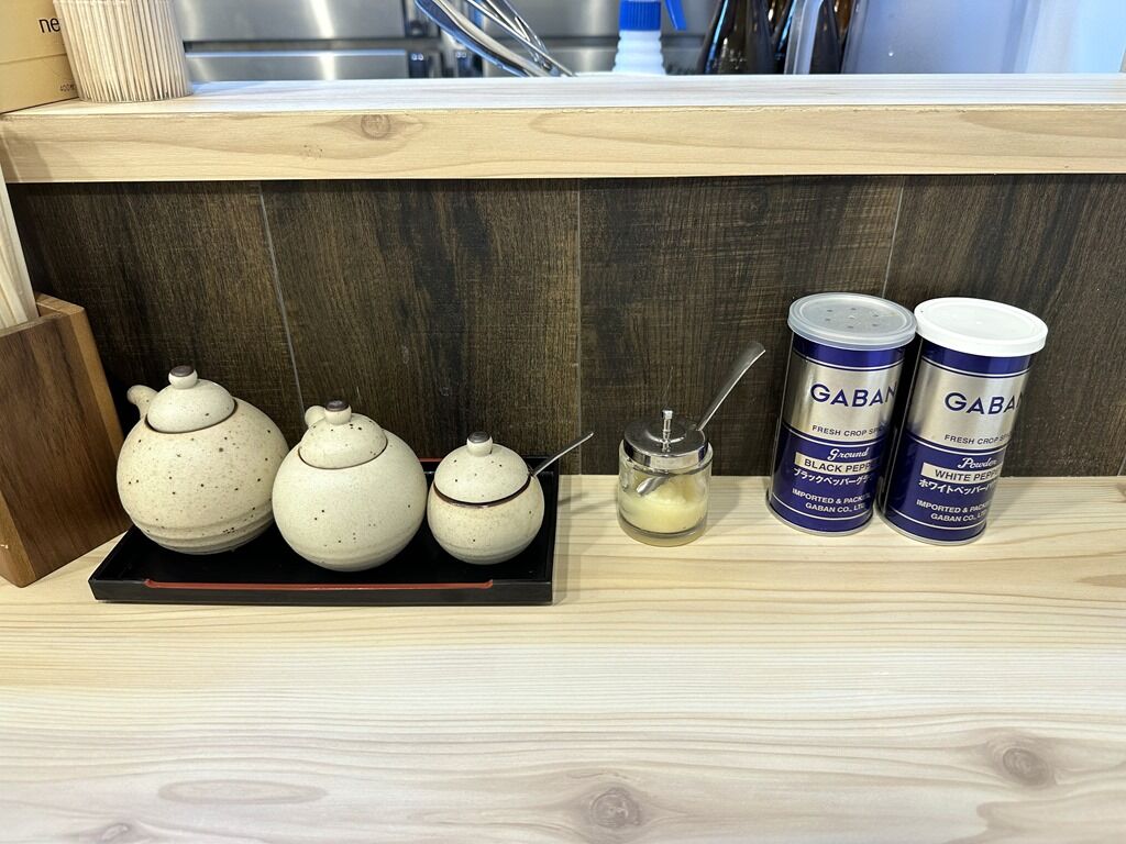 BGMはJ-POP、曲名特定出来ず。箸は割り箸。卓上調味料は醤油、酢、ラー油、GABANブラックペッパー・ホワイトペッパー。