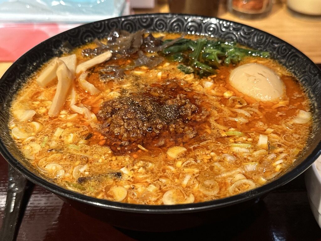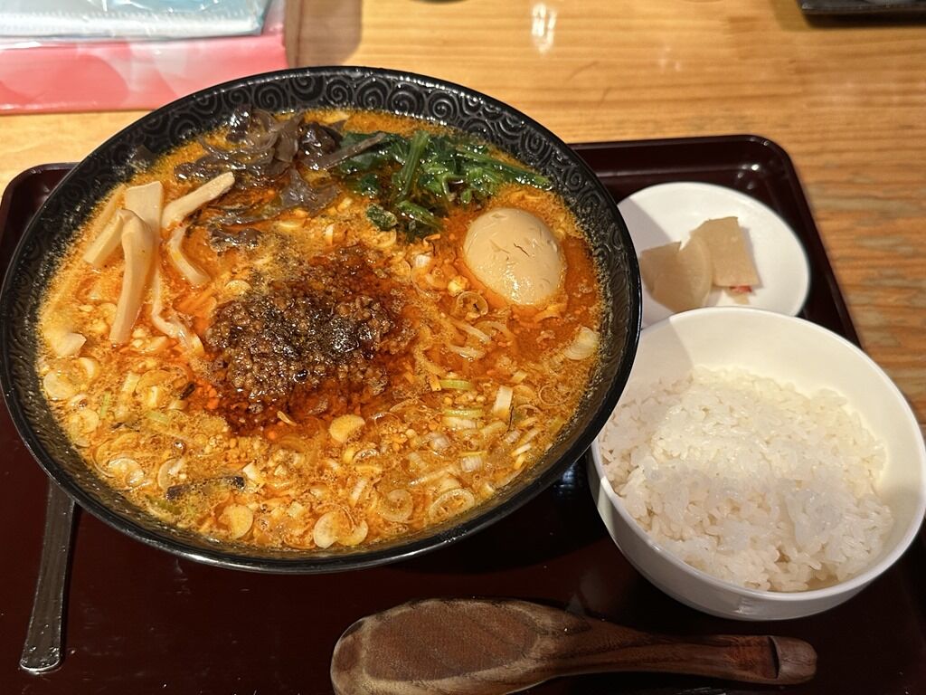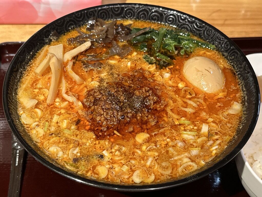 担々麺らしからぬトッピングもてんこ盛りで具だくさん、サービスライスと合わせてボリューム満点でお腹いっぱいになります。