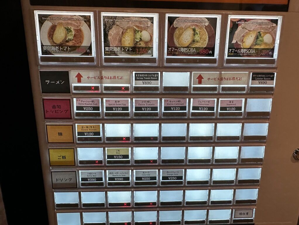入店するとまず券売機で食券購入です。主なメニューは、東京海老トマトシンプル盛り890円、サービス盛り980円、オマール海老蕎麦シンプル盛り980円、サービス盛り980円、他。サービス盛りはキャベツとバゲットが付いて+90円とお得。
