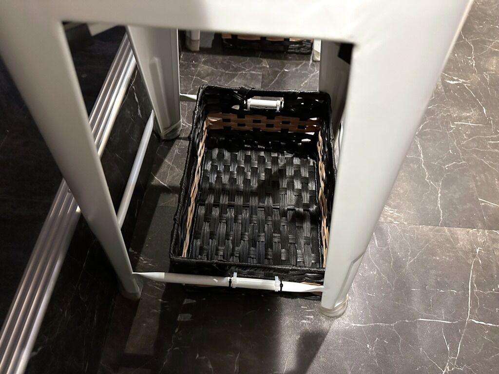 紙エプロンは券売機横にセルフで。箱ティッシュはカウンター下。椅子の下には荷物カゴ設置。