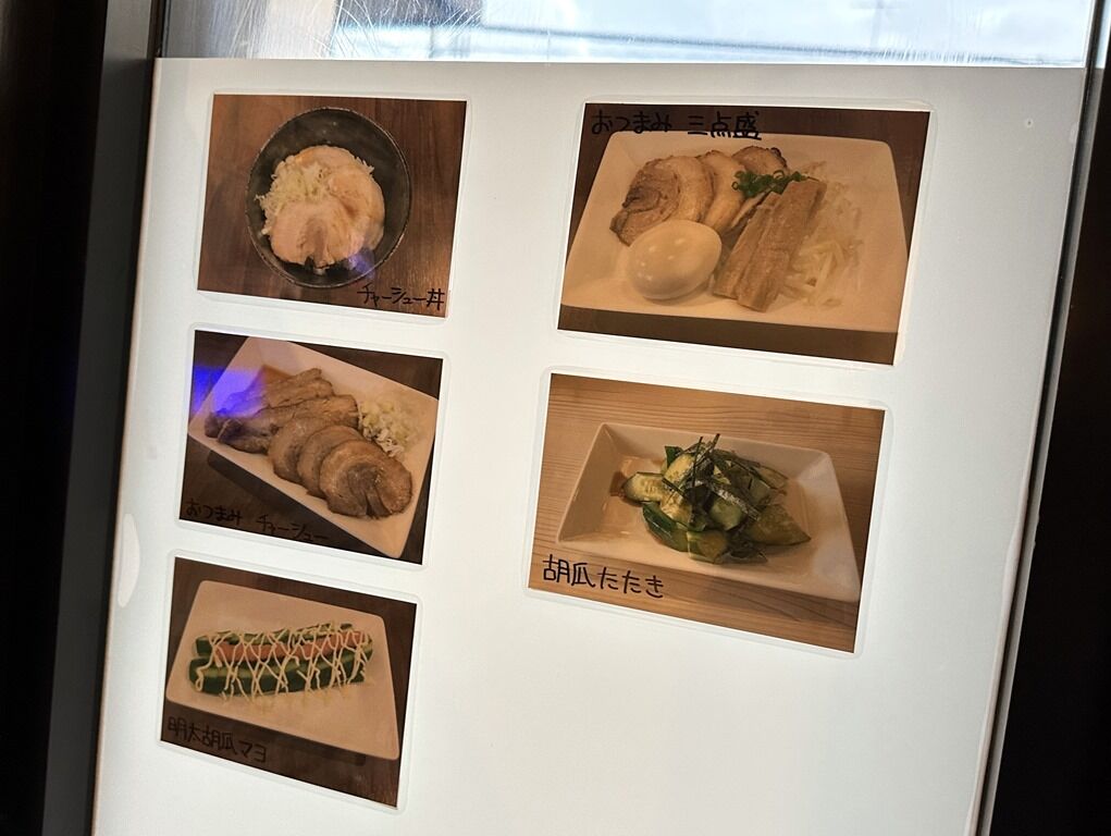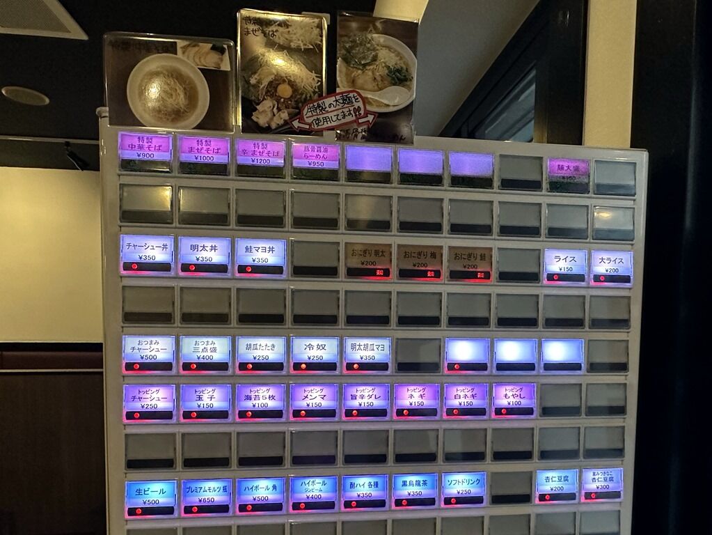 入店するとまず券売機で食券購入です。主なメニューは、特製中華そば900円、特製まぜそば1000円、豚骨醤油らーめん950円、チャーシュー丼・明太丼・鮭マヨ丼350円、他。