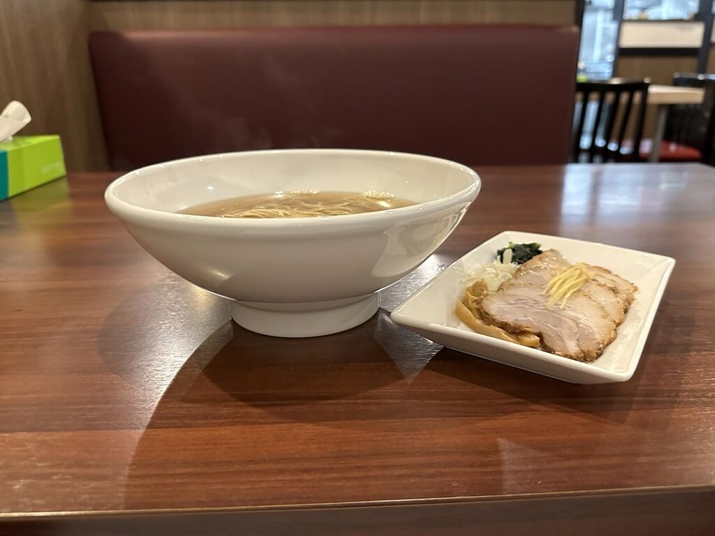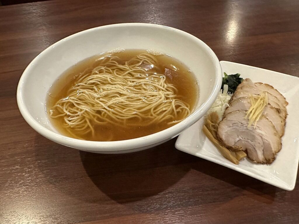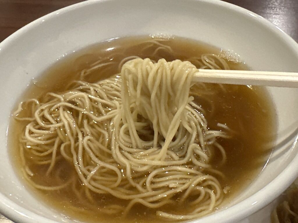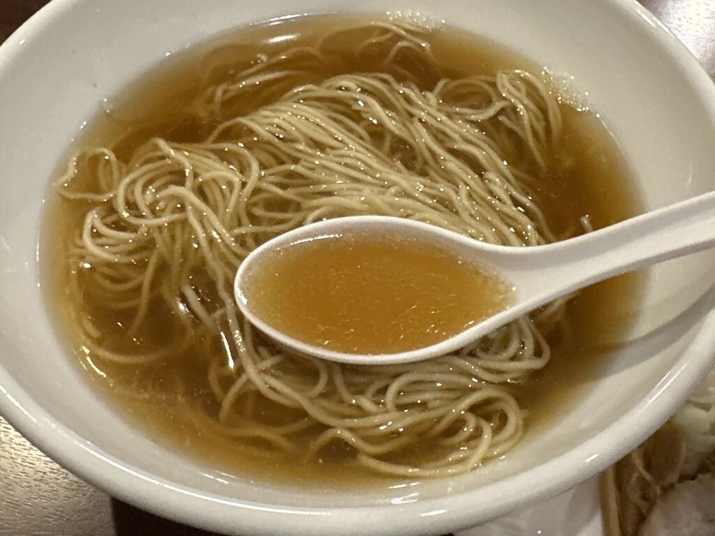別皿の具は、チャーシュー5枚、メンマ、ほうれん草、ねぎ、チャーシューの上に針生姜。チャーシューはそのまま食べると冷たい油のベタつき感が気になりますが、スーに入れて熱が入ると、とろっとろのとろけるチャーシューに変化して美味!スープはさらさらの清湯醤油味、、魚介、乾物、節系の和風出汁に生姜がカッツリと効いたあっさりとした味わい。シンプルながら惹きのあるもう一口が止まらない味。少ししょっぱめながら、飽きのこない味わいでとても美味しい!
