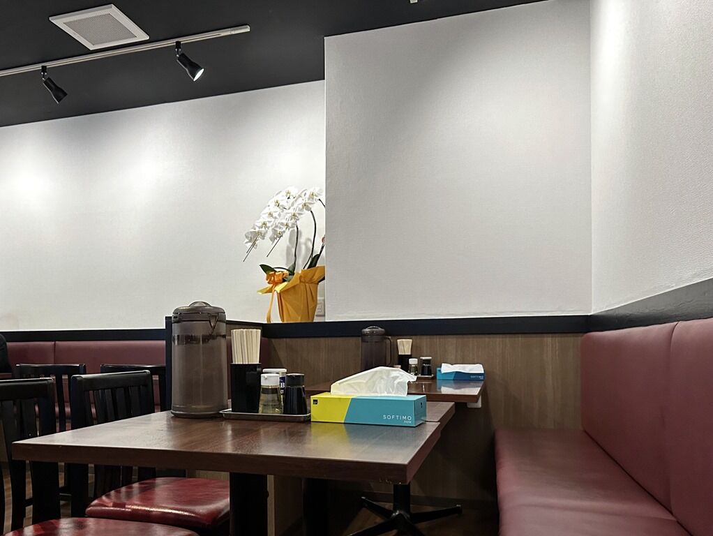 「特製」が付かない醤油らーめん、まぜそばは無く、ディフォが特製仕立て。店内は入って左手壁の向こうが厨房で、右手が客席スペース。席は4人卓x5、6人卓x1。カウンターはなくすべてテーブル席。18:30頃到着で、先客3、後客8で盛況な入り。