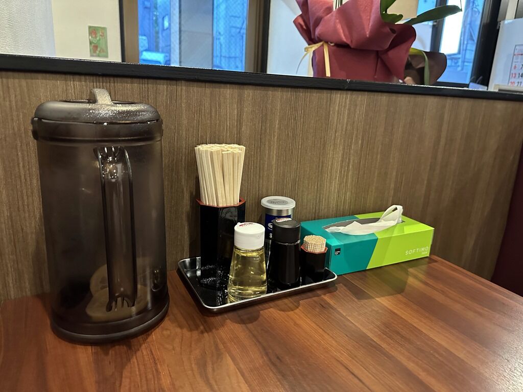 スタッフは厨房・ホールに男女合わせて5名。紙エプロンは必要かどうか聞いてくれます。BGMはポップス。箸は割り箸。卓上調味料はS&Bブラックペッパー、醤油、酢。
