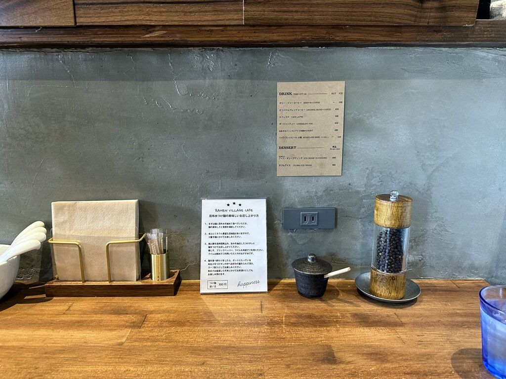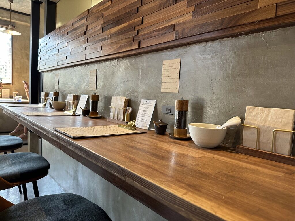 BGMはシティポップス。箸は割り箸。卓上調味料はペッパーミル入り粒黒胡椒、深海塩。