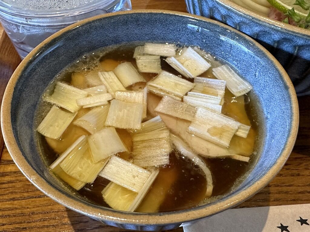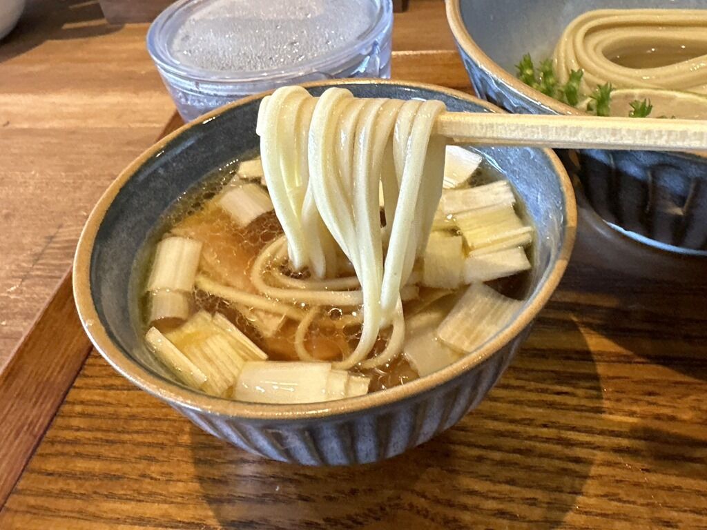 つけ汁はさらさらの清湯醤油味。釣りと豚を長時間煮込んで旨みを抽出したというもの。出汁の旨みたっぷり。