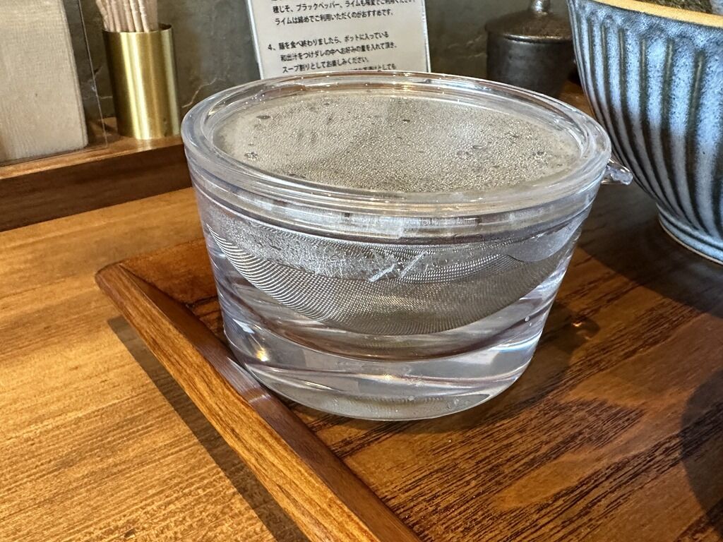 同時に提供されたのがポット入り和出汁。〆の割りスープとして利用。蓋付きなので冷めずらいのが高ポイント。自分のタイミングで好みの濃さに調整できるのもグッド。