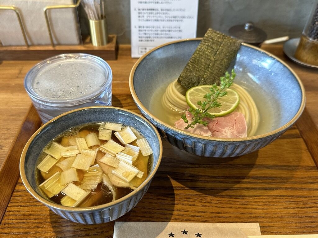 麺はたっぷりの昆布水に浸かっています。昆布水つけ麺の多くが昆布水を〆のスープ割りにとしている中、専用の割りスープを出してる点に拍手!具は麺の上にチャーシュー、ライム、穂紫蘇、海苔。つけ汁には駒切りのねぎ、チャーシュー、メンマ。つけ麺のビジュアルは「ヨコスト」そっくり相似形。