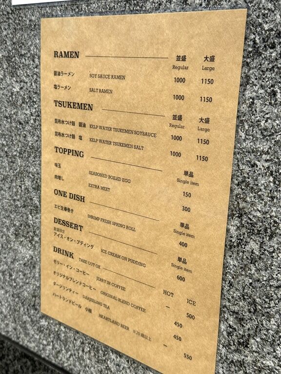 しばし待ちの後入店着席。券売機は無くメニューを見て注文、伝票方式、食後レジにて会計制。主なメニューは、醤油ラーメン1000円、塩ラーメン1000円、昆布水つけ麺 醤油1000円、昆布水つけ麺 塩1000円、他。