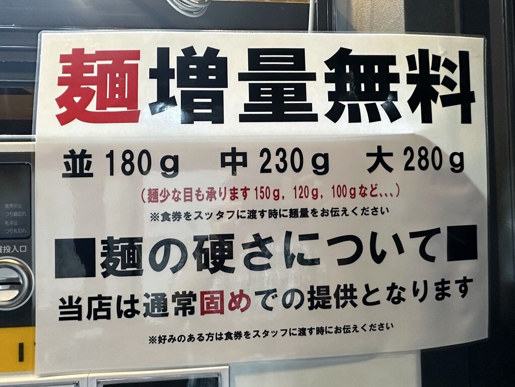 麺量は並180g、中230g、大280g同料金。ちなみに替玉は120g。食券を渡すと、麺量の確認があります。麺少なめ指定、グラム指定可能。