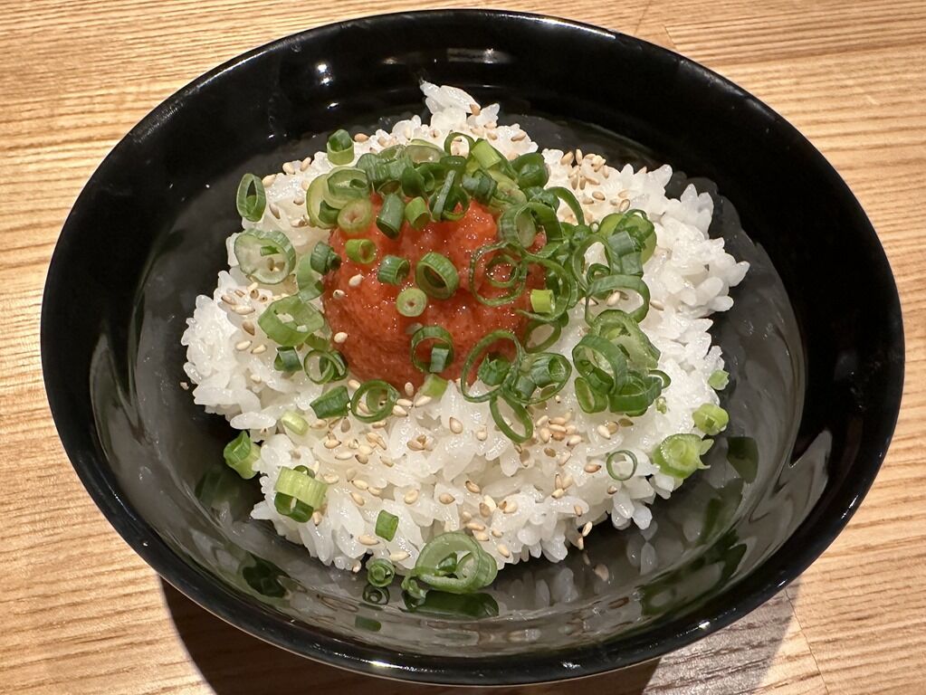「明太子ご飯」。業務用チューブ明太子ではなく、ちゃんと一腹分をほぐしてご飯に載せた一品。旨いです。