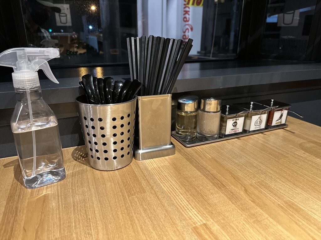 BGMはテレビ放送、TBS「ジョブチューン」、「ローソンスイーツ」特集、なうオンエア。箸は洗い箸で資源環境に配慮。卓上調味料は酢、胡椒、煮干専用内臓オイル、にんにく。辛味噌。