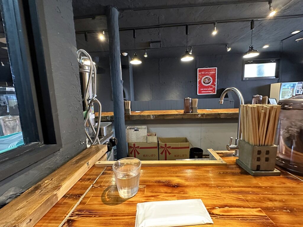 BGMはロカビリー、からのTHE BLUE HEARTS「キスしてほしい(トゥートゥートゥー)」、他♪ 箸は竹製の洗い箸で資源環境に配慮。卓上調味料は無し。