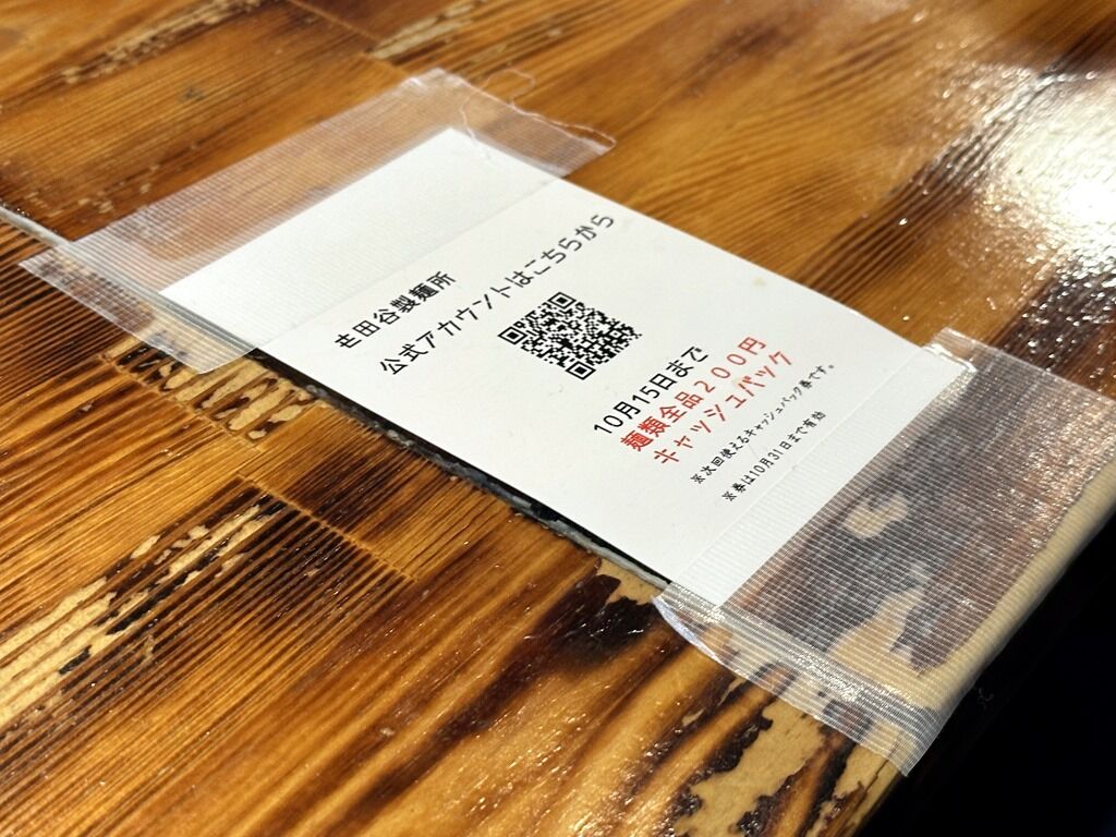 X(旧ツイッター)フォローで、10月15日まで麺類全品200円キャッシュバック。券売機で普通に食券買って、スタッフに食券渡す際にフォロー画面を見せると、ポチ袋で200円キャッシュバックされます。