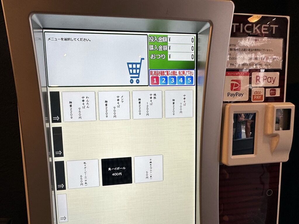 定刻にオープン。開店シャッター待ちは8名ほど。入店するとまずタッチパネル式券売機で食券購入です。主なメニューは中華そば700円、焼豚中華そば1200円、メンマ中華そば900円、わんたん中華そば950円、不織布エプロン50円、他。麺量ゆで前220gとデフォで大盛り仕様。麺半分対応可能。