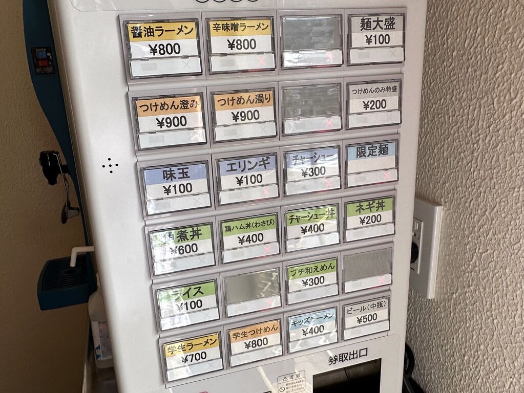 入店するとまず券売機で食券購入です。主なメニューは、醤油ラーメン800円、辛味噌ラーメン800円、つけめん澄み900円、つけめん濁り900円、角煮丼600円、鶏ハム丼(わさび)400円、チャーシュー丼400円、ネギ丼200円、プチ和え麺300円、他。