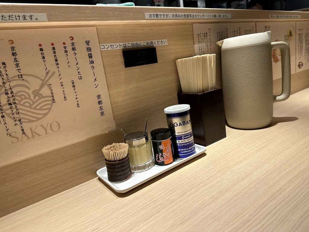 BGMはJ-POP。箸は割り箸。卓上調味料はおろしニンニク、七味唐辛子、GABANブラックペッパー。