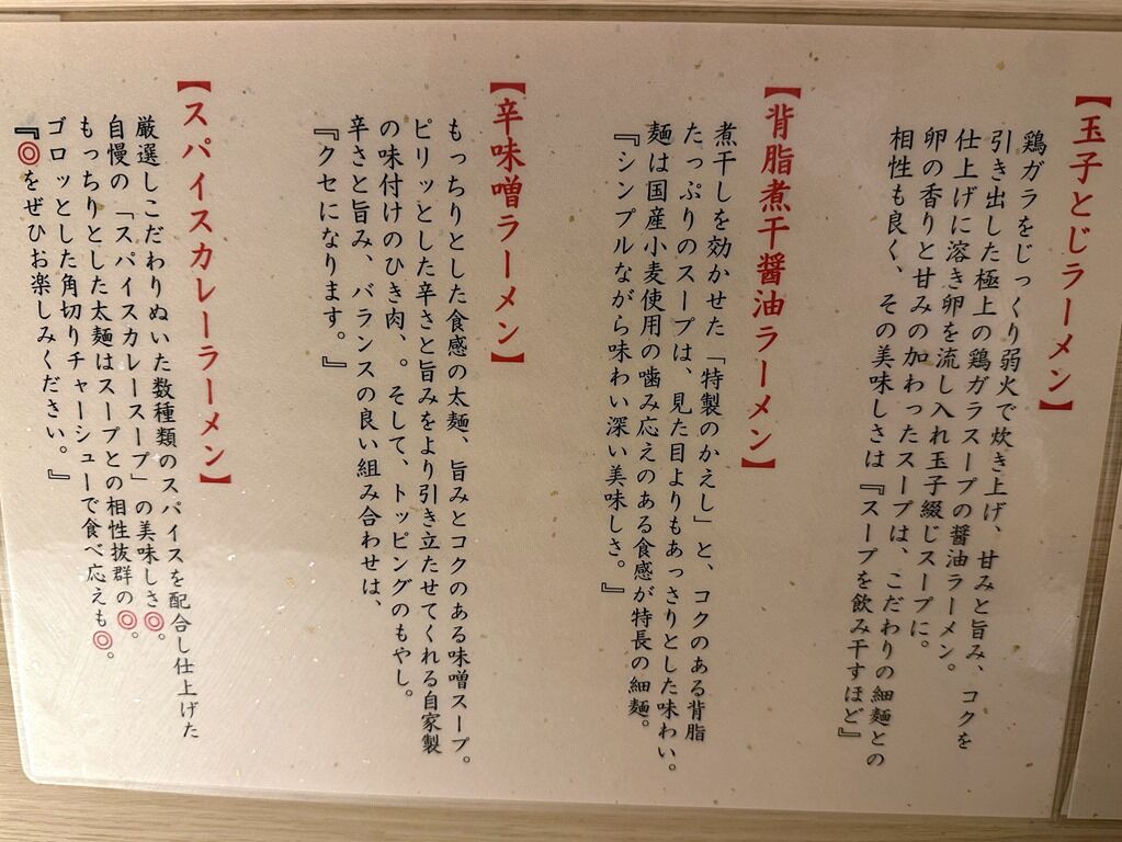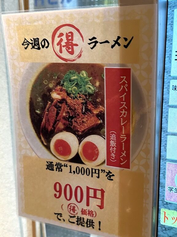 主なメニューは玉子とじラーメン900円、背脂煮干醤油ラーメン900円、辛味噌ラーメン1000円、スパイスカレーラーメン(追い飯付き)900円、他。