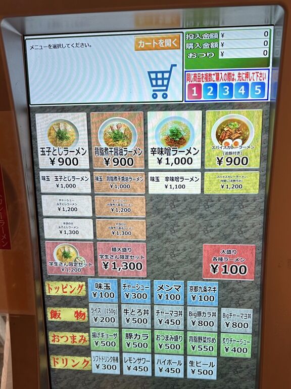入店するとまずタッチパネル式券売機で食券購入です。タッチパネル式ですが、タブは切られてなくてベーシックなボタン式券売機同様見通し良好です。
