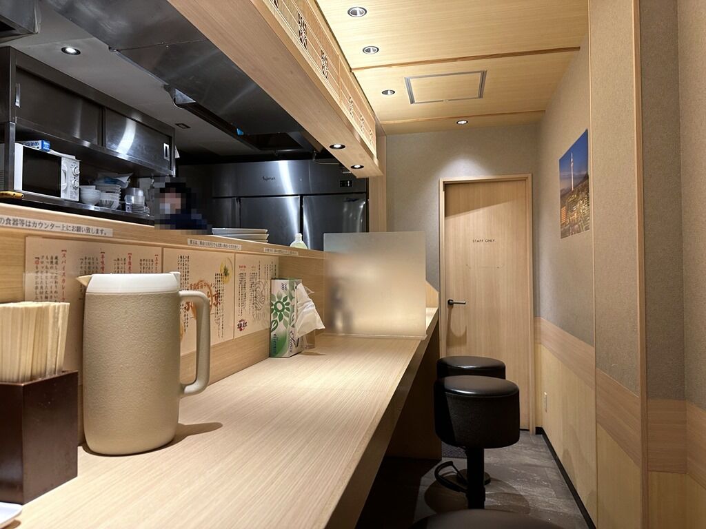 訪店時、スパイスカレーラーメンは通常1000円のところ、今週のマル特ラーメンとして100円引で提供。奥に細長い店内は、厨房を囲むL字型カウンター10席(短辺2、長辺3・間・3・間・2)、4人卓x3、2人卓x1。