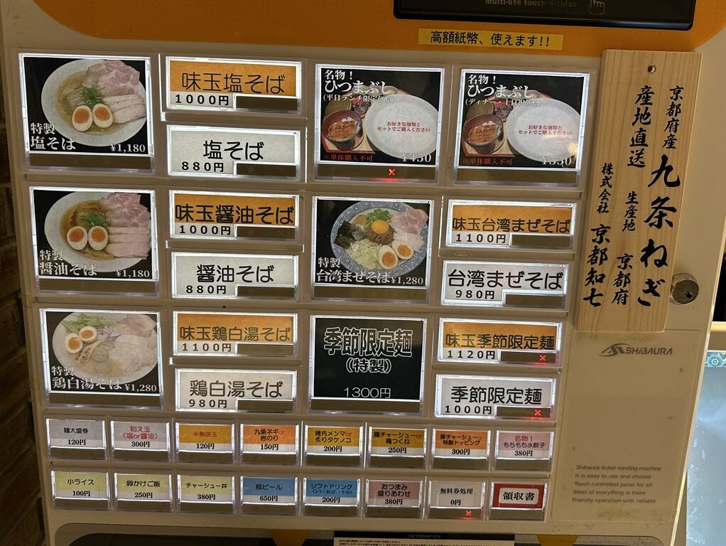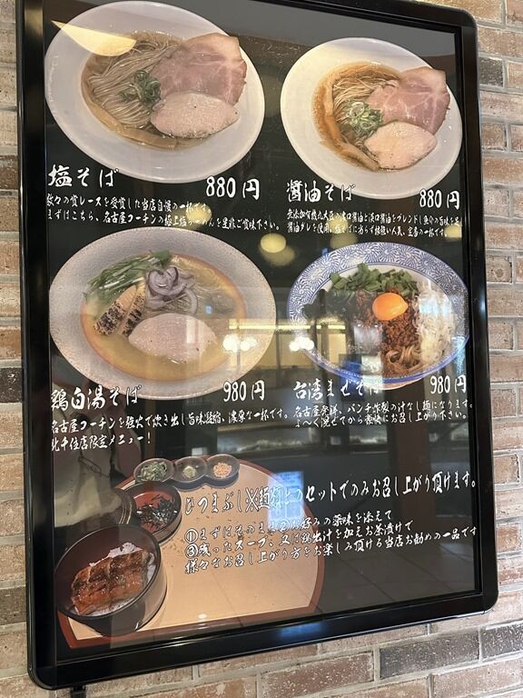 入店前にまず店頭券売機で食券購入です。主なメニューは、塩そば880円、醤油そば880円、台湾まぜそば980円、鶏白湯そば980円(北千住店限定)、和え玉(塩or醤油)300円、玉子かけご飯250円、名物!ひつまぶし 平日ランチ450円・ディナー土日祝550円、他。
