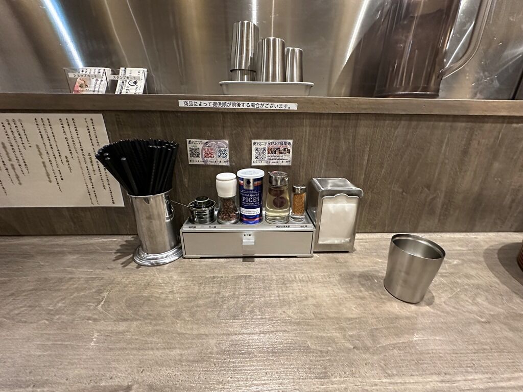 BGMは無し。箸は割り箸。卓上調味料は柚子胡椒、花山椒、Chefeelブラックペッパー、季節の果実酢、柚子胡椒。