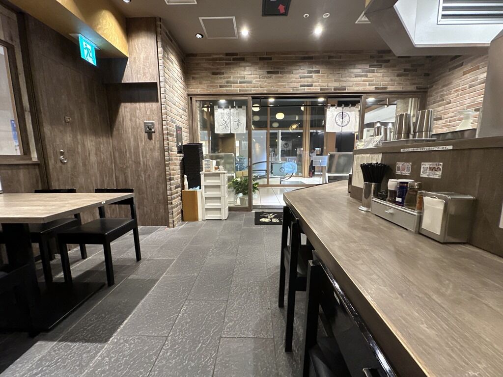 店内は厨房を囲む角が斜めにカットされたカウンター12席(長辺:4・間・3、角2、短辺:3)、4人卓x3。