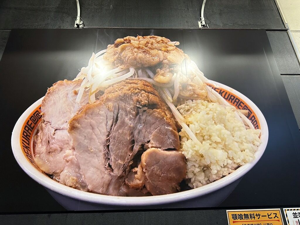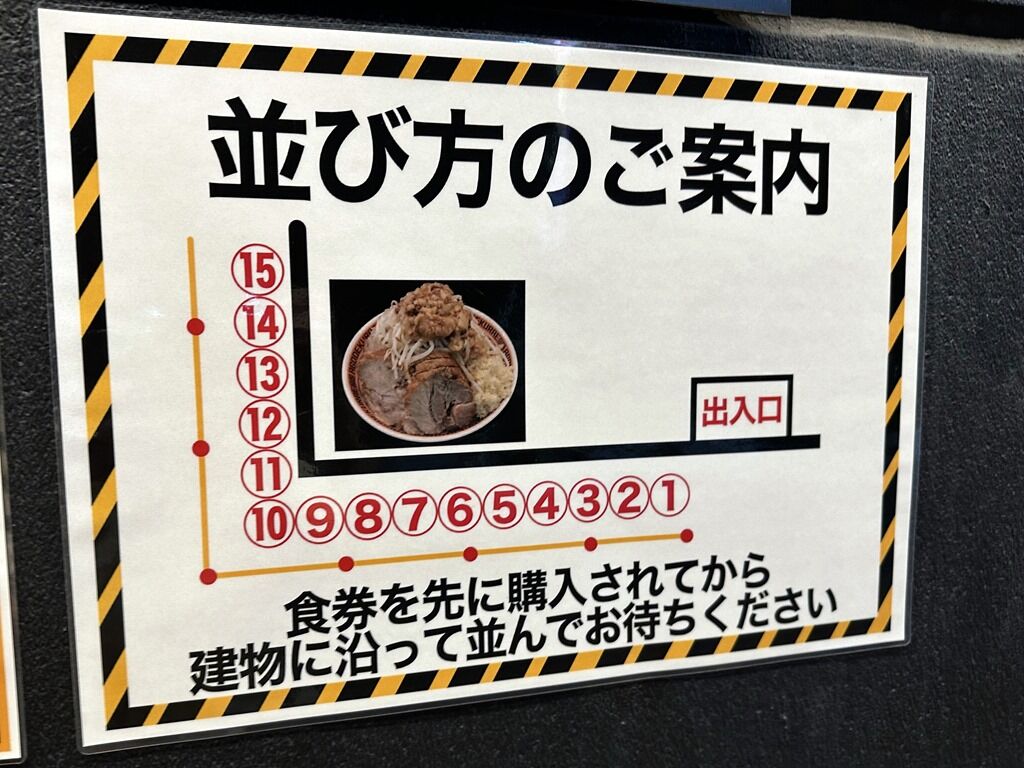 無料トッピングはヤサイ、アブラ、ニンニク、マシまで。マシマシにしたい場合1種類ごとにマシマシ券100円購入。コールのタイミングは食券回収時。