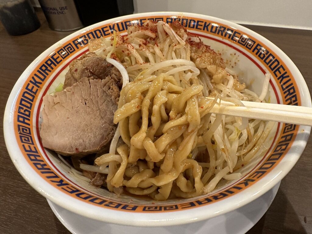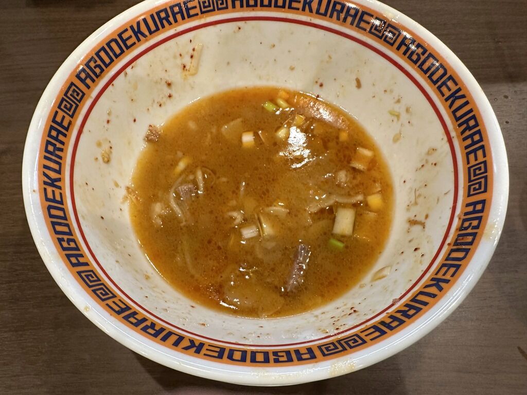 アゴクラさんは汁なしの場合、スープ割り出来るんです。前客後客汁なし・辛汁なしの注文多いですが、スープ割り注文してる人がいなくて不思議。みなさん麺だけで腹パンかな!?汁なしの麺を少量残してスープ割りするとプチラーメンになって、2度美味しい!汁なし&ラーメン両方食べたい欲を満たしてくれます。