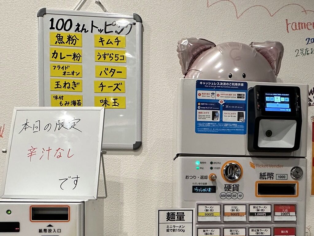 入店するとまず券売機で食券購入です。主なメニューは、ラーメン(豚1枚)900円、汁なし(豚1枚)900円、限定ラーメン(豚1枚)1000円、ミニラーメン(小豚1枚)800円、ミニ汁なし(小豚1枚)800円、ミニ限定ラーメン(小豚1枚)900円、他。この日の限定ラーメンは辛汁なし。