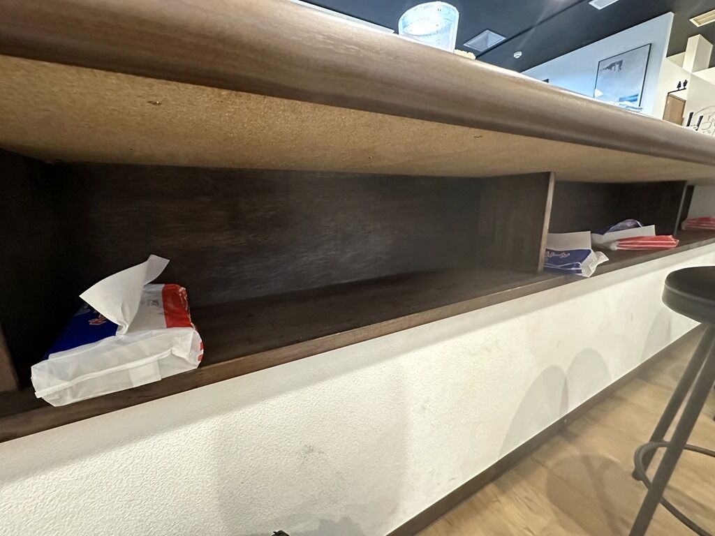 紙エプロンは給水器そばに配置。テッシュはカウンター下。