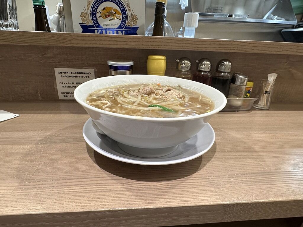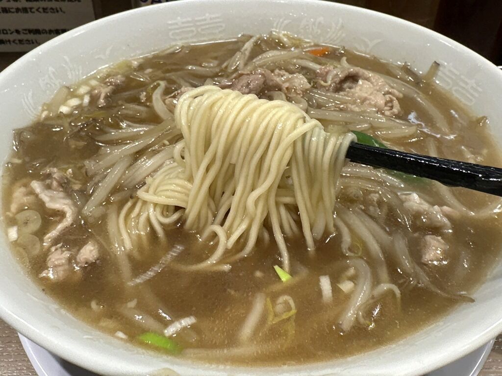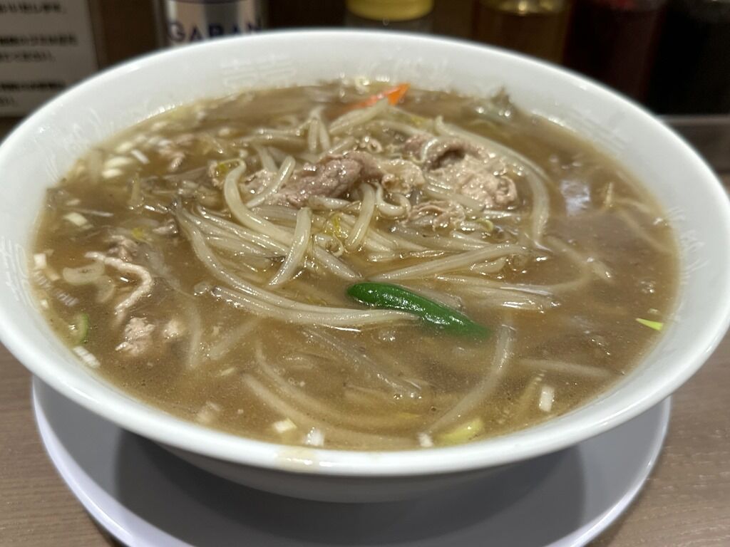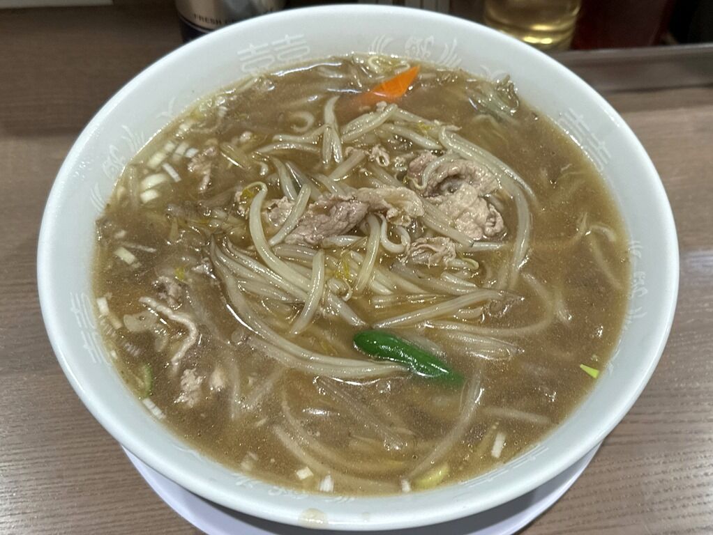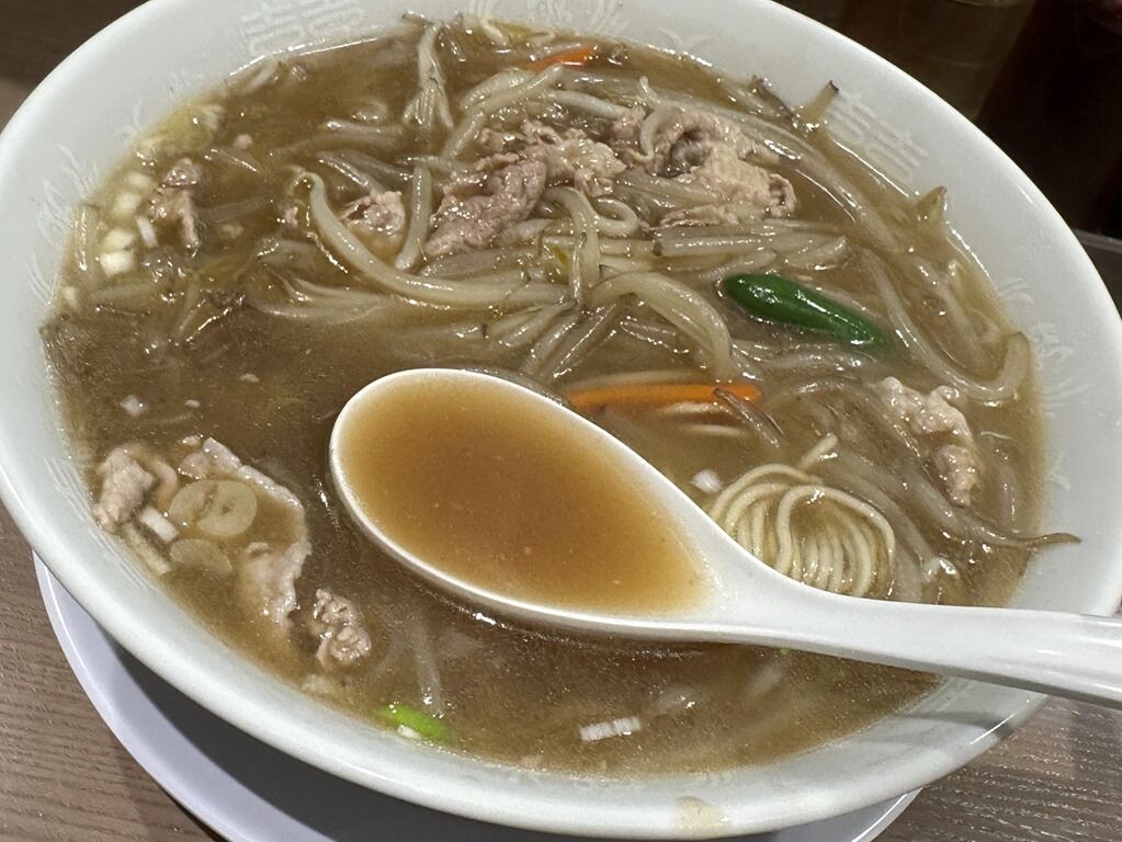 スープはさらさらの清湯醤油味。ですがすぐにとろみ餡がスープと一体化してとろみスープ状態に。もやしが主役のタンメンか、サンマーメン的な一品。シンプルで素朴な優しい味ながら、どこか懐かしくてホッとする癖になるまた食べたくなる味わい。