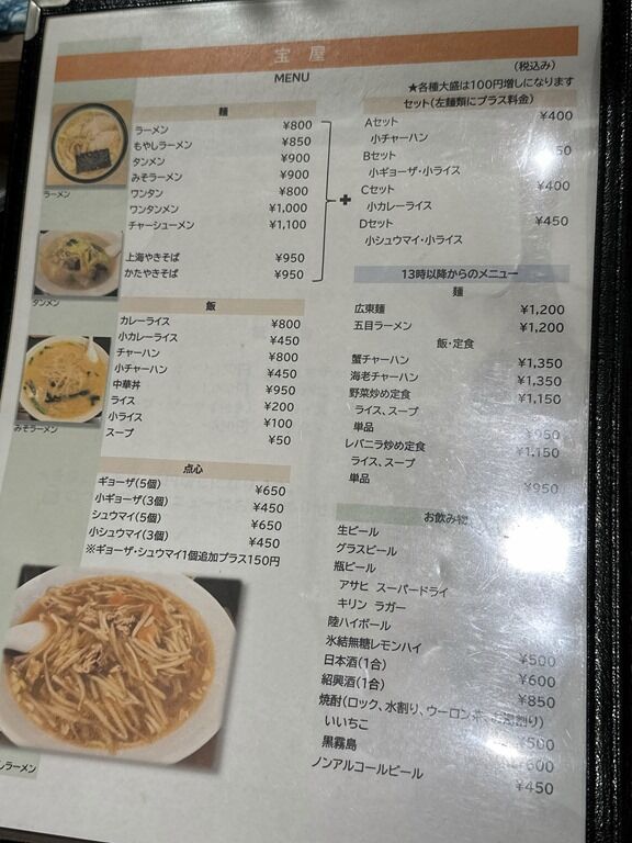 主な麺メニューはラーメン800円、もやしラーメン850円、タンメン900円、みそラーメン900円、上海やきそば950円、かたやきそば950円、他。ご飯類、定食、一品料理各種ラインナップ。