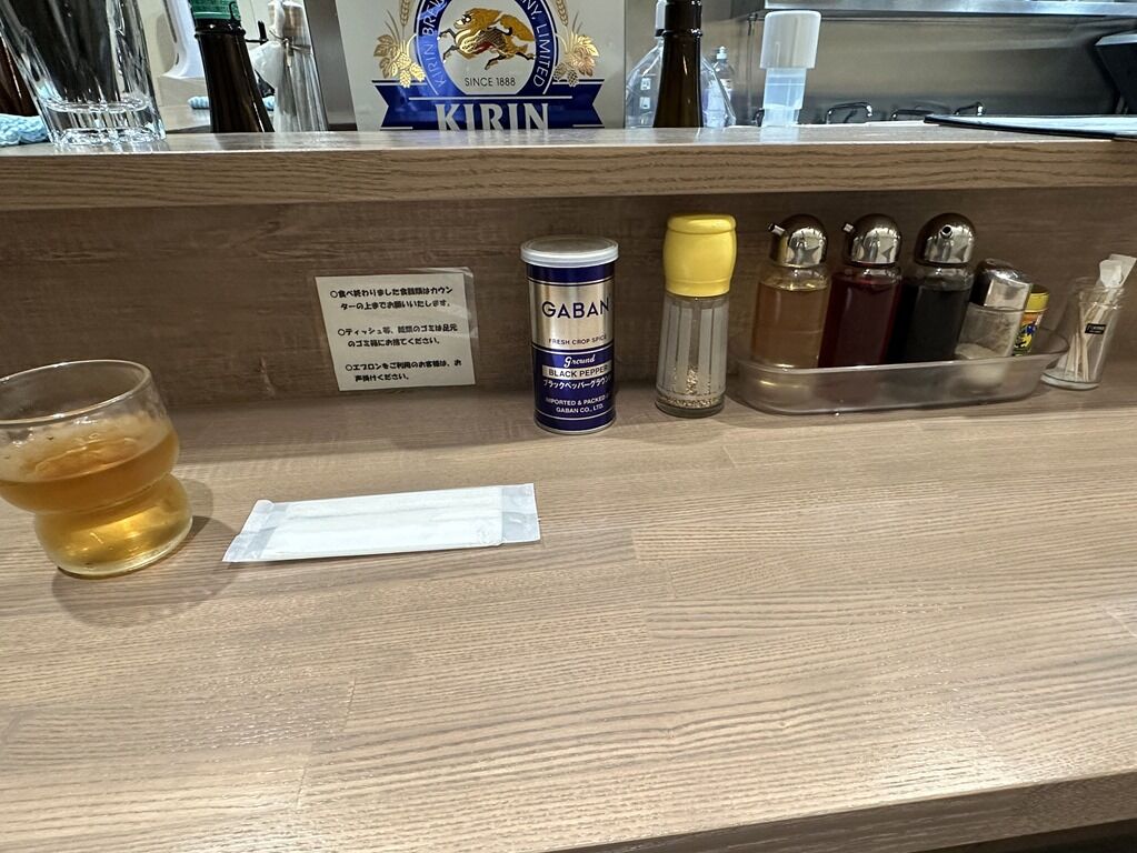 BGMは無し。箸は洗い箸で資源環境に配慮。卓上調味料はGABANブラックペッパー、すり胡麻、酢、ラー油、醤油、八幡屋礒五郎七味唐辛子。