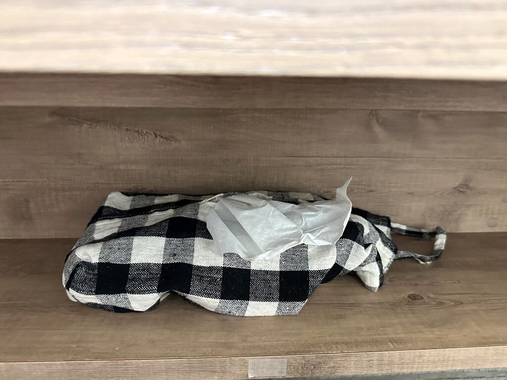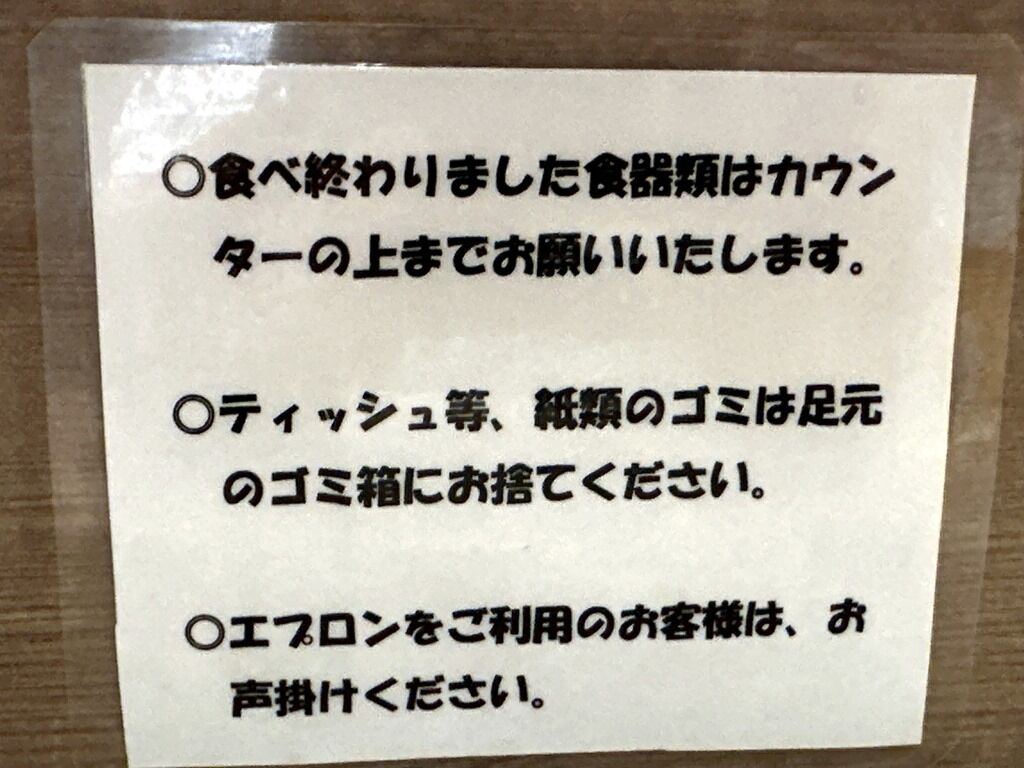 箱ティッシュはカウンター下。紙エプロンはレジ横に配置ですが申告制。