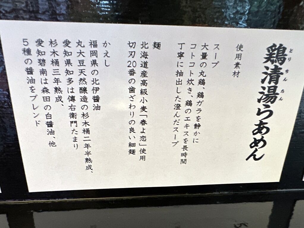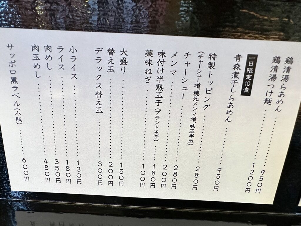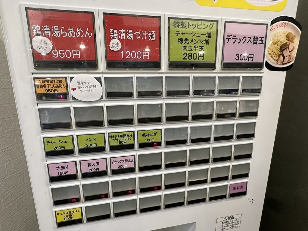 定刻3分前嬉しい早開けオープン。入店するとまず券売機で食券購入です。主なメニューは、鶏清湯らあめん950円、鶏清湯つけ麺1200円、青森煮干中華そば(1日限定10食)950円、デラックス替玉300円、味付け半熟玉子180円、他。