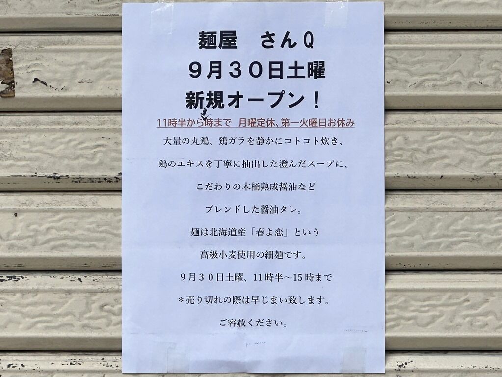 2023年9月30日大安&一粒万倍日のW吉日、本日オープンの新店「麺屋 さんQ」へ。