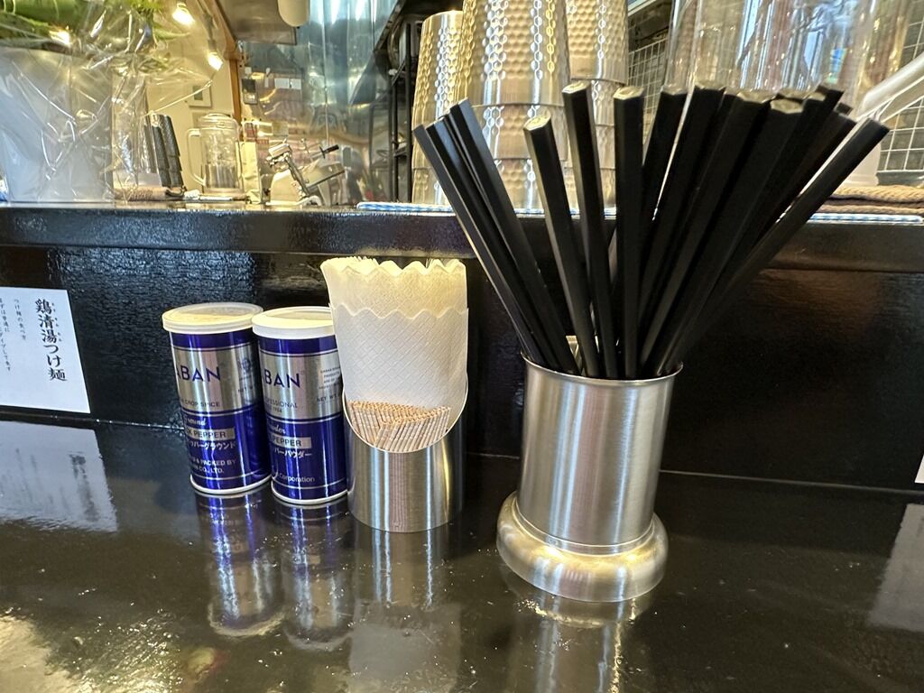 BGMはポップス。箸は洗い箸で資源環境に配慮。卓上調味料はGABANブラックペッパー・ホワイトペッパー?