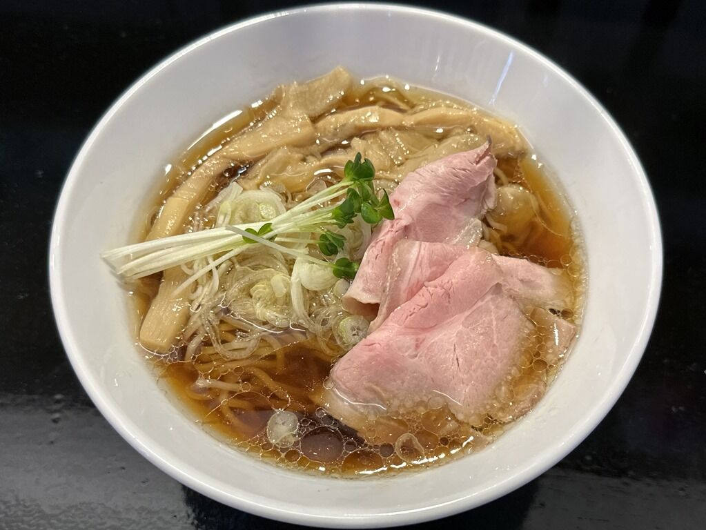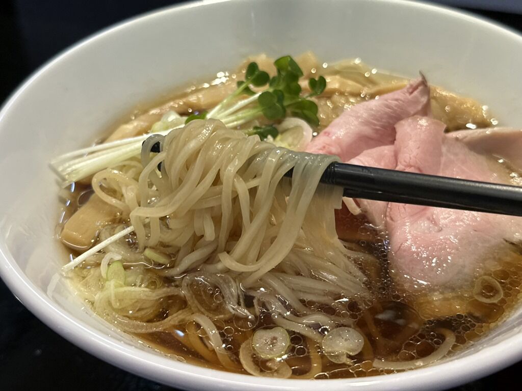スープはさらさらの清湯醤油味。大量の丸鶏、鶏ガラを静かに長時間コトコト炊き鶏のエキスを抽出したスープとのこと。かえしは5種の醤油をブレンド。派手さはありませんがキレとコクが両立した、キレッキレながらしみじみと沁み入る味わい。鶏水系の王道的これぞな味わいですごく美味しい!