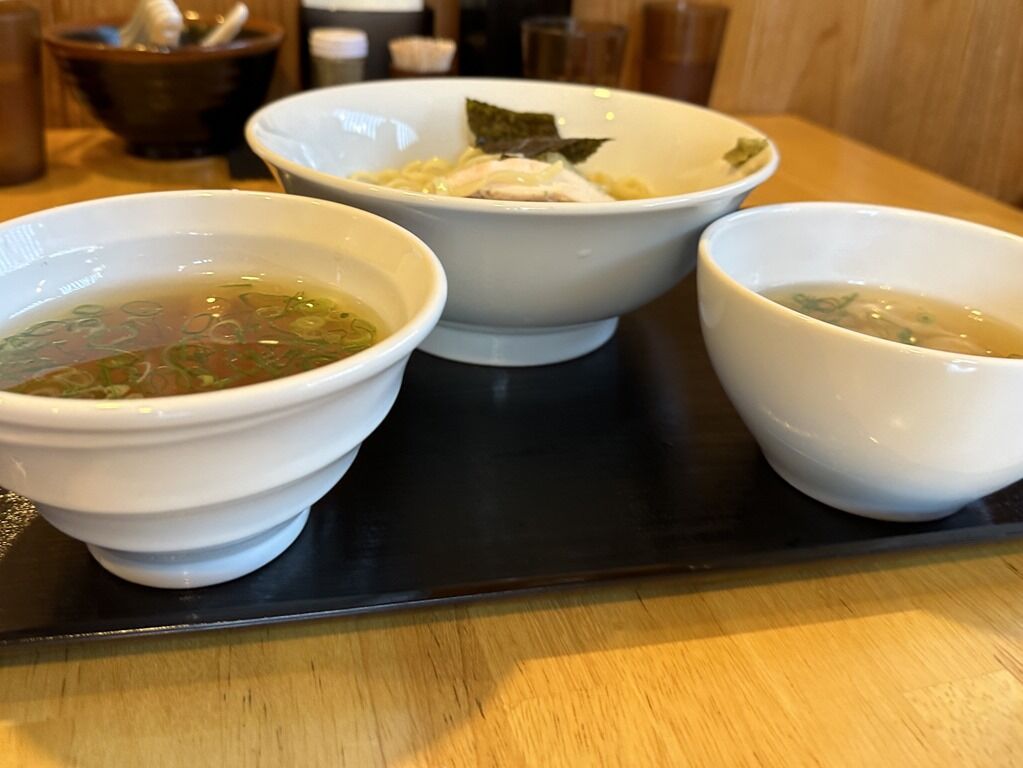 ワンタンはてっきりつけ汁の中に入って来るかと思いきや、なんと別お椀のスープワンタンとして提供。つけ麺に具入りスープが付いてくる感じで、これは嬉しいです。「つけそば(白)」を選んだためか、「ワンタン麺 白」のスープにワンタンが浮かんできました。