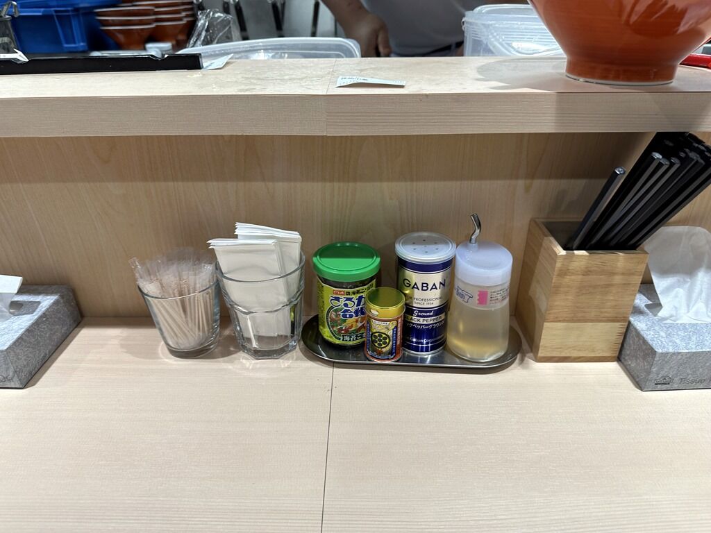 BGMはJ-POP、Time goes by、Over Drive、他♩箸は洗い箸で資源環境に配慮。卓上調味料は、やま磯さるかに合戦ふりかけ、八幡屋礒五郎七味唐辛子、GABANブラックペッパー、酢。
