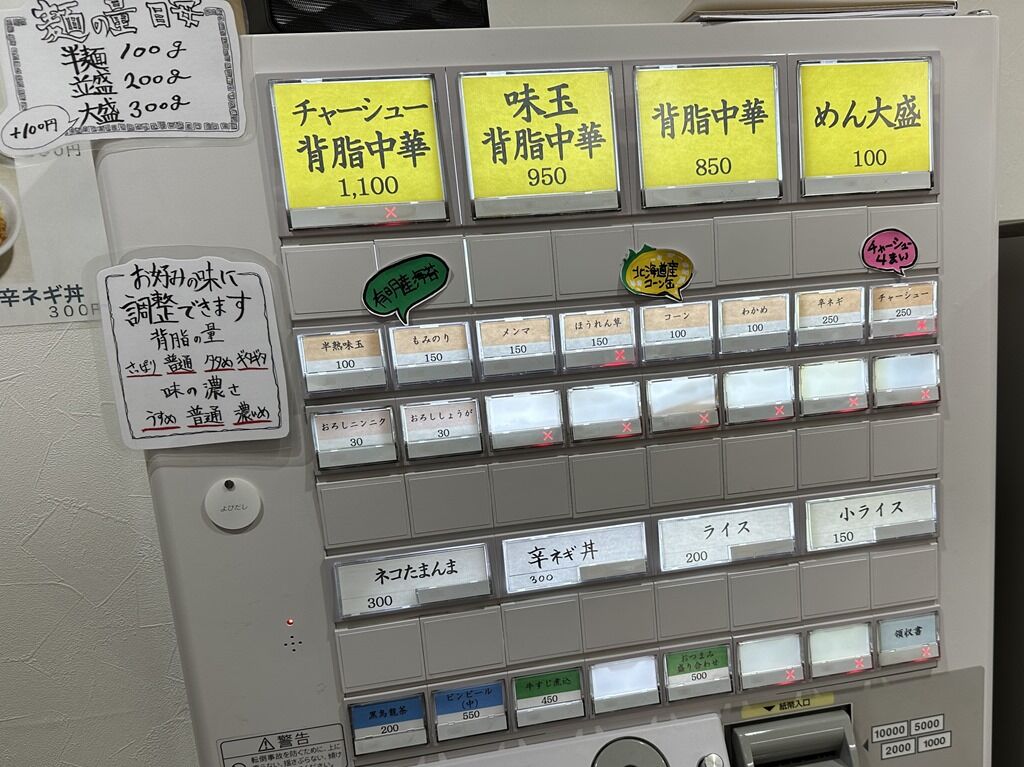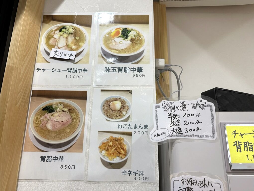 先に食券買ってから列ぶシステム。主なメニューは、背脂中華850円、味玉背脂中華950円、チャーシュー背脂中華1100円、ネコたまんま300円、辛ネギ丼300円、他。