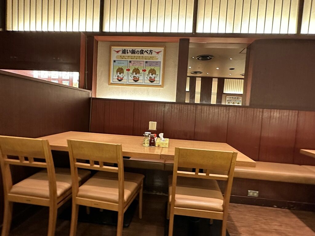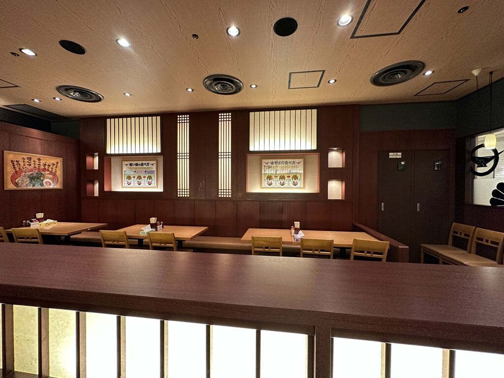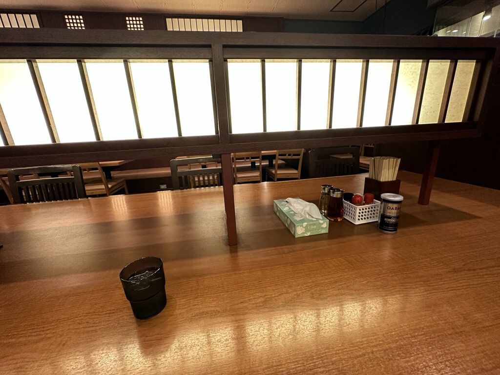 店内は奥が厨房で手前が客席スペース。席は店に向かって左右両側に6人卓x1、4人卓x2のテーブル28席、中央に奥に長い真ん中に高い衝立を立てた対面カウンター12席(6・6)、計40席。