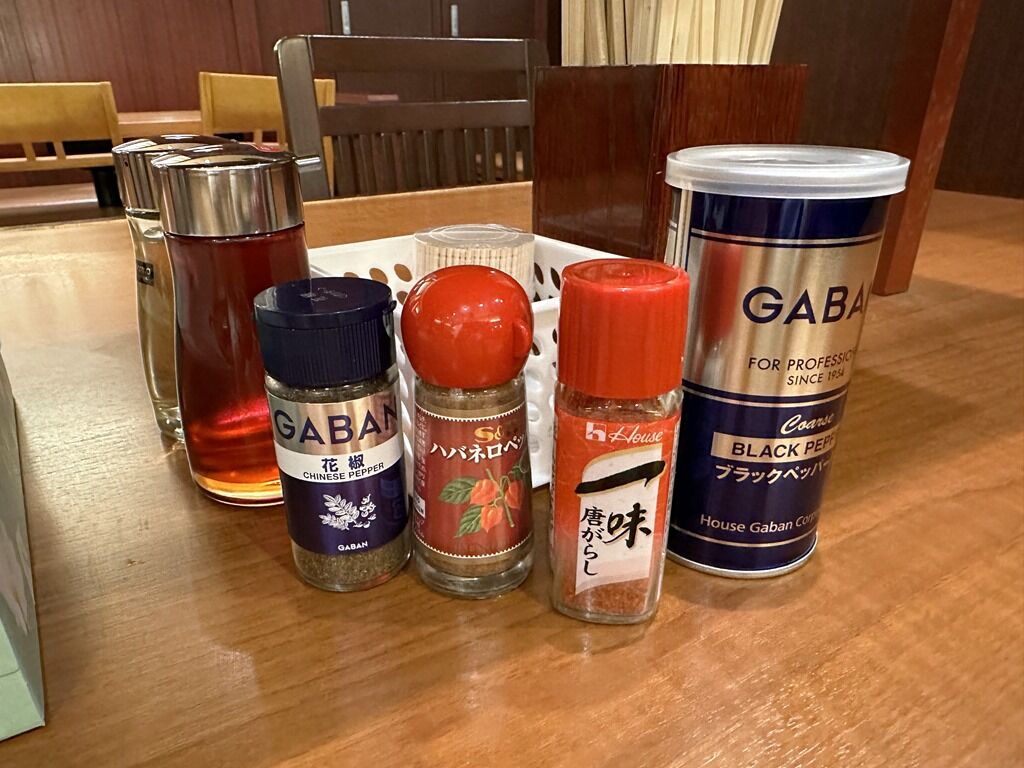 BGMは環境音楽。箸は割り箸。卓上調味料は酢、ラー油、GABAN花椒、S&Bハバネロペッパー、House一味唐がらし、GABANブラックペッパー。